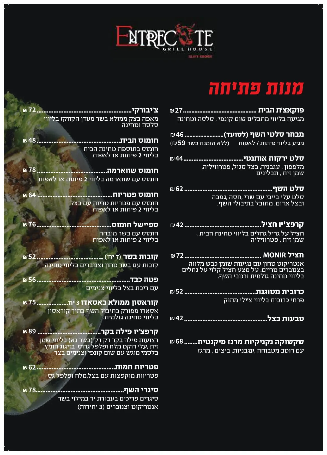 ₪42 ( לא הזמנת בשר ₪59)מגיע בליווי פיתות / לאפותסלט ירקות אותנטי