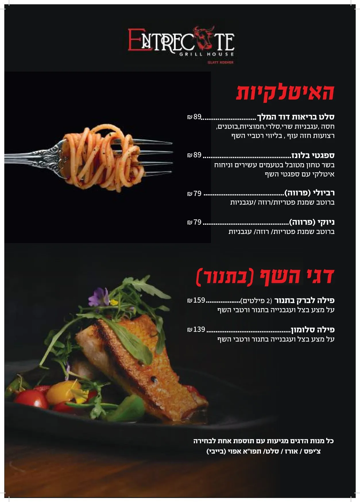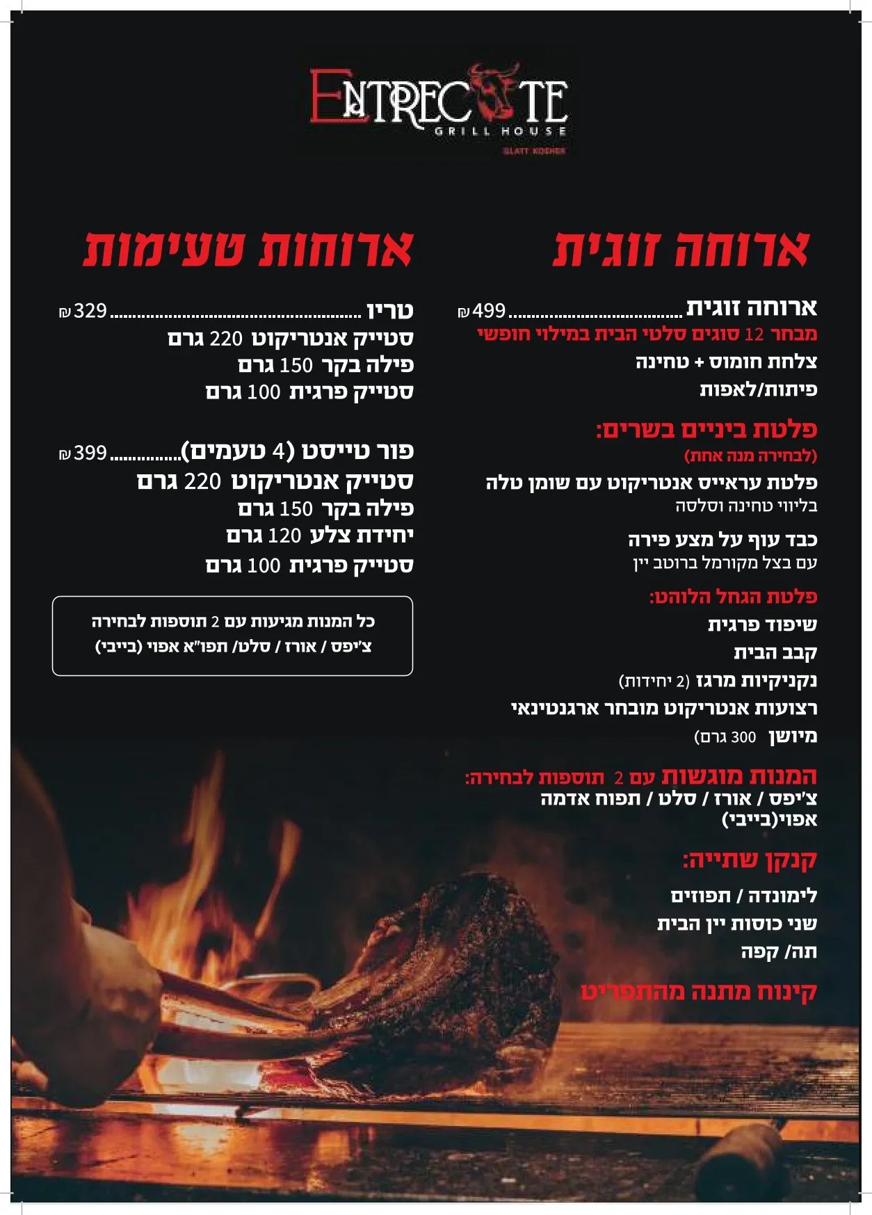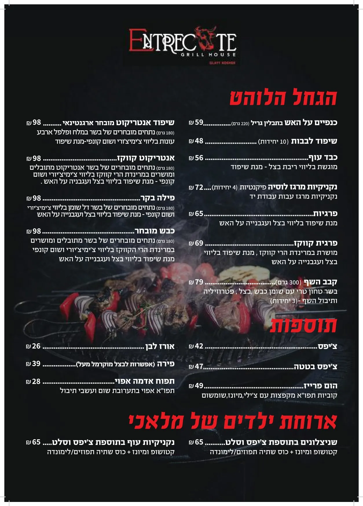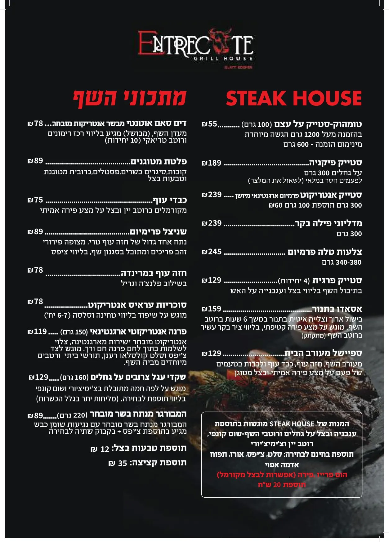 ₪120מוגש על לפה חמה מתובלת בצ'ימיציורי ושום קונפי בליווי תוספת לבחירה. מליחות יתר בגלל הכשרותדים סאם אוטנטי מבשר אנטריקות מובחר