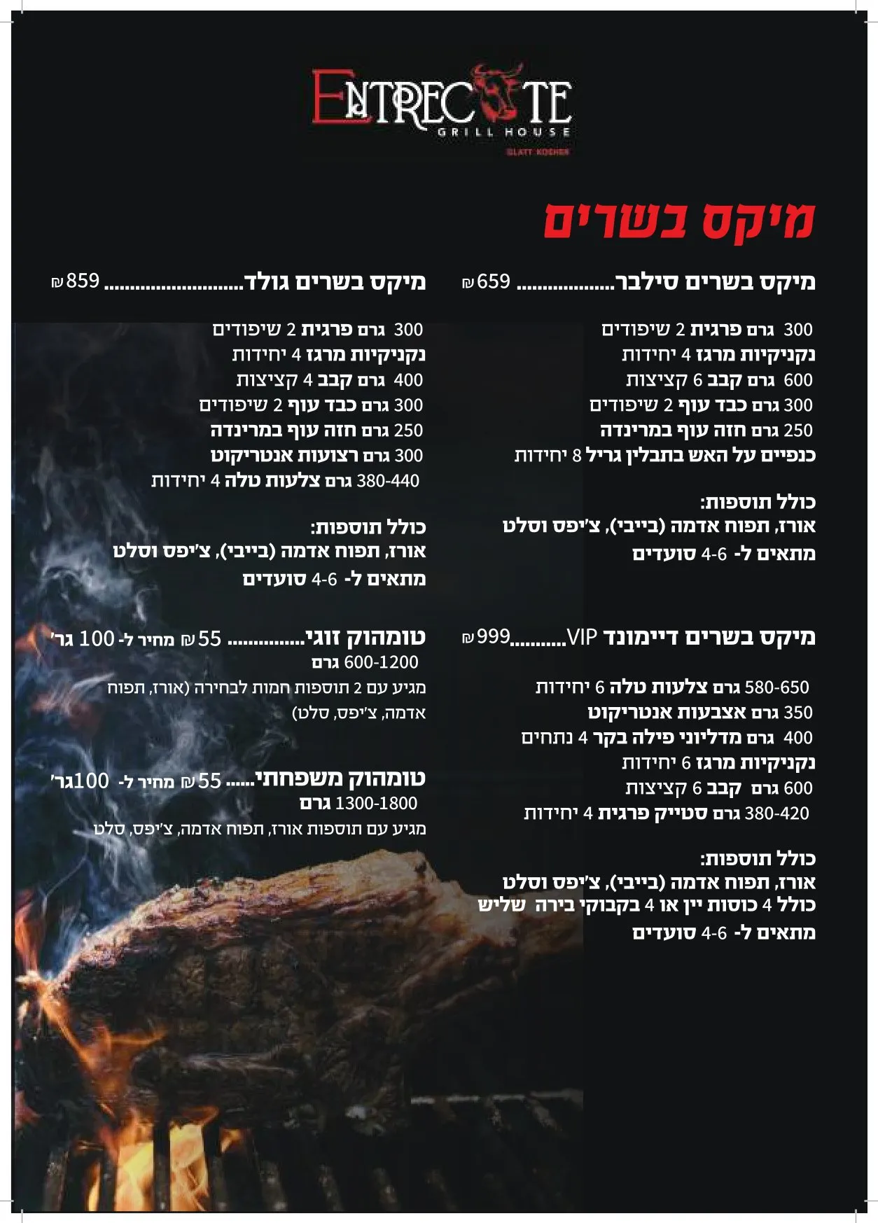 ₪89(180 גרם) ) נתחים מובחרים של בשר במלח ופלפל ארבע עונות בליווי צ'ימיצ'ורי ושום קונפי-מנת שיפודאנטריקוט קווקז