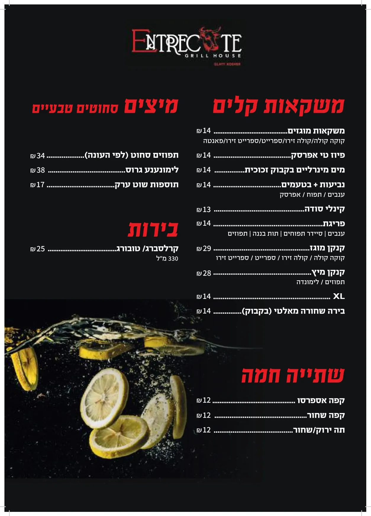 ₪58אנטריקוט טחון עם נגיעות שומן כבש מלווה בצנוברים טריים. על מצע חציל קלוי על גחלים בליווי טחינה גולמית ורטבי השף.כרובית מטוגנת